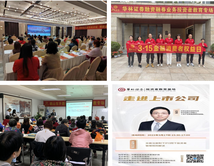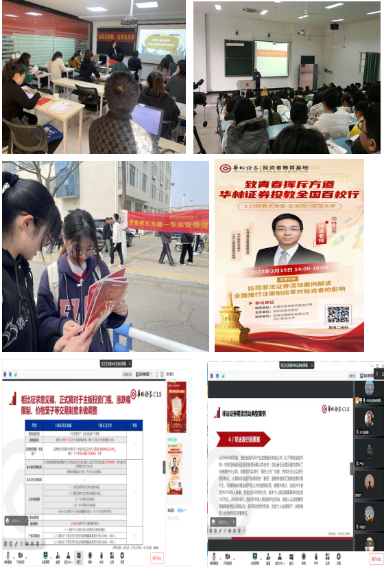 四是我司3月开展了“投资者教育进百校”活动,分别在四川外国语大学、太原科技大学、徐州工程学院、烟台大学等25所高校,以“致青春挥斥方遒,华林投教高校行”为主题,开展系列线上线下金融知识普及、防范非法证券活动、全面注册制等相关知识讲座。开展知识讲座,为高校学子普及金融知识和风险防范知识,助力高校学子体系化投资知识框架搭建,识别金融风险,提高学生风险防范意识。