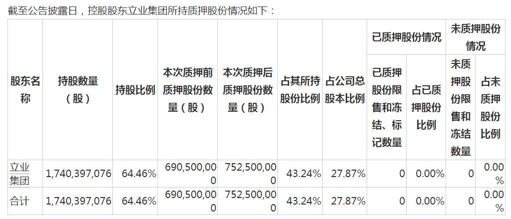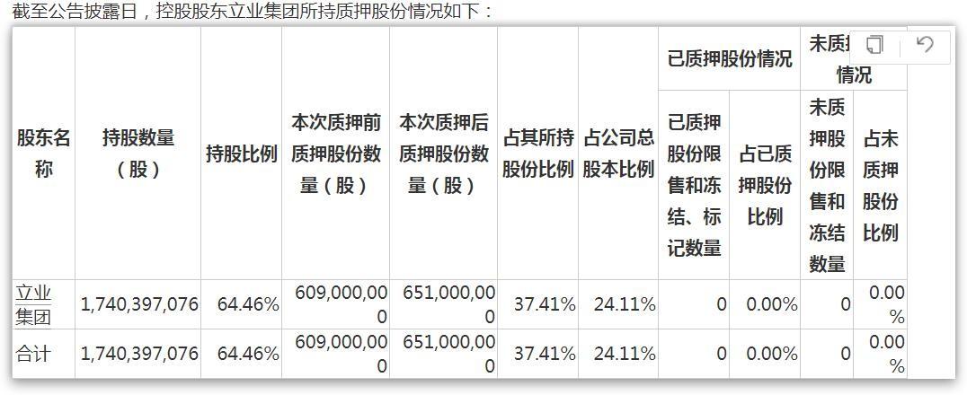 2023年2月10日,立业集团解除质押股份数量1.6亿股,紧接着公司再次先后4次质押股份;5月10日,立业集团又解除质押股份数量5250万股。在多次质押动作后,截至5月19日公告披露日,立业集团持股数量17.4亿股,持股比例64.46%;累计质押股份数量7.53亿股,占公司总股本27.87%。