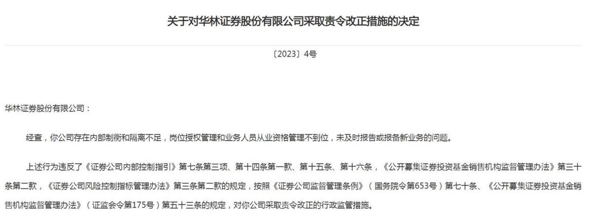 4月7日,西藏证监局公布的行政监管措施显示,经查,华林证券存在内部制衡和隔离不足,岗位授权管理和业务人员从业资格管理不到位,未及时报告或报备新业务的问题,被西藏监管局责令改正。
