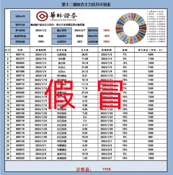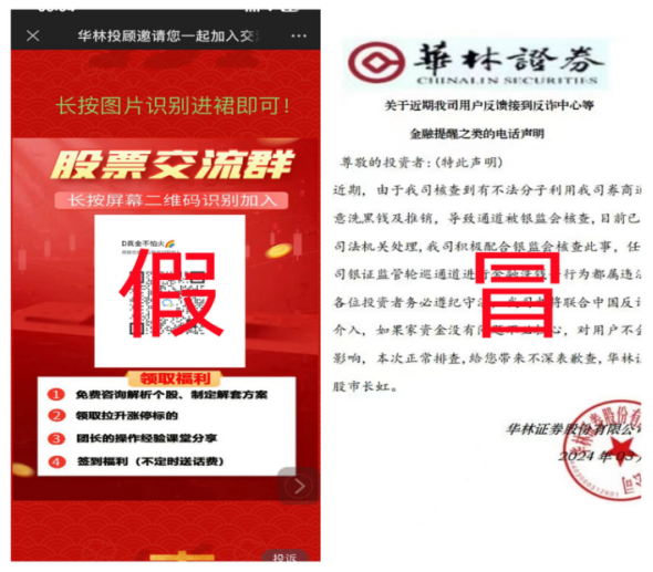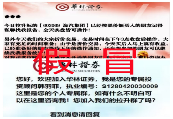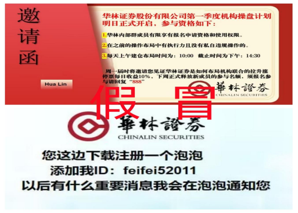 近日,华林证券股份有限公司(以下称“华林证券”或“我司”)发现有不法分子冒充我司工作人员、合作机构、微信群组、企业微信群组等,发布带有我公司名称、水印的“担保协议”、“坐庄计划”、“荐股视频”等,通过短视频平台、网站、电话、QQ、微信、MChat私密聊、短信等方式骗取投资者的信任,以推荐股票、推荐机构业务、提供打板和打新服务、提供一级市场权限、内部新股申购、诱导下载“华林资管”、“华林证券”等假冒APP、承诺收益、收取指导费等为名目,进行非法证券活动。此类行为不仅对华林证券的名誉造成严重影响,也对广大投资者的利益带来极大损害。