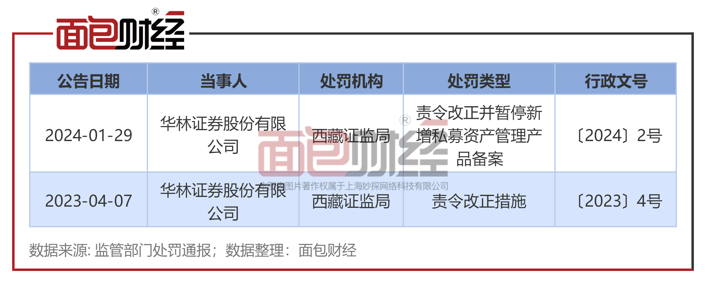 面包财经梳理监管部门通报显示,2023年以来,华林证券被证监局开出两张机构罚单。