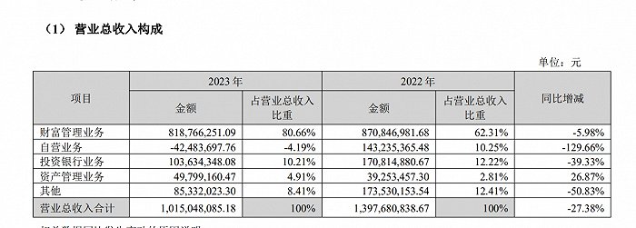 财报显示,几个主要营业项目中,只有资产管理的营收出现了同比增长,其他项目均有不同程度的下滑。