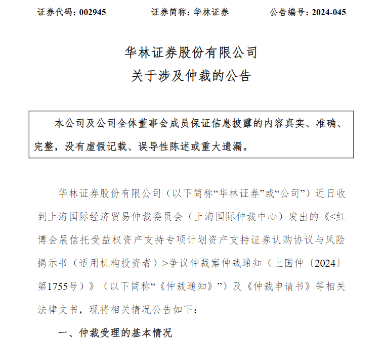 7月3日,华林证券披露了《华林证券关于涉及仲裁的公告》,公告显示公司近日收到上海国际经济贸易仲裁委员会(上海国际仲裁中心)关于《红博会展信托受益权资产支持专项计划资产支持证券认购协议与风险揭示书(适用机构投资者)争议仲裁案仲裁通知(上国仲〔2024〕第1755号)》,民生证券作为申请人对华林证券提起仲裁。
