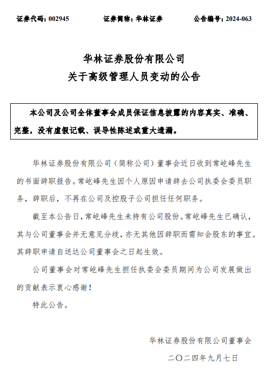 9月6日晚间,华林证券(002945.SZ)官宣:常屹峰先生因个人原因申请辞去公司执委会委员职务,辞职后不再在公司及控股子公司担任任何职务。对这位高管的离职,华林证券董事会致以衷心感谢。