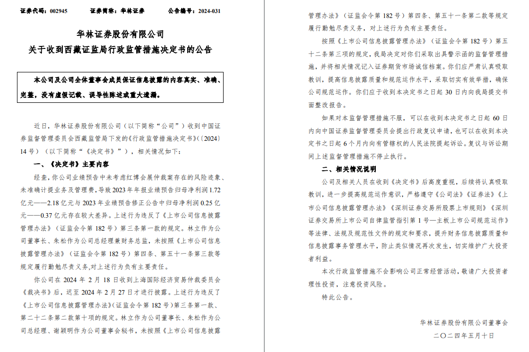 今年5月7日,西藏证监局点名华林证券2023年度业绩预告中未考虑红博会展仲裁案存在的风险迹象、未准确计提业务及管理费,导致业绩预告修正前后存在较大差异;在收到上海国际经济贸易仲裁委员会《裁决书》后未及时披露的违规行为。连同未履行勤勉尽责义务的董事长林立,总经理朱松和董秘谢颖明,均被采取出具警示函的监督管理措施,并将相关情况记入证券期货市场诚信档案。因为同样的原因,深交所在今年6月21日致函华林证券及三名高管(时任)。