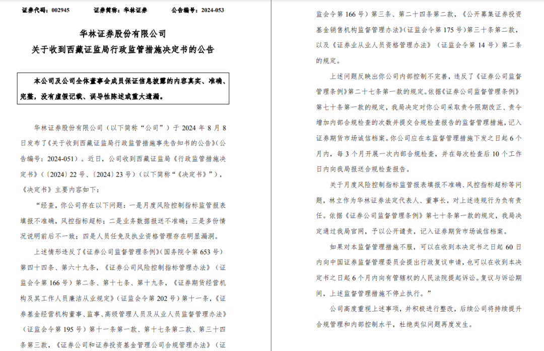 对前述监管处罚,华林证券同样表示,“公司高度重视上述事项,并积极进行整改,后续公司将持续提升合规管理和内部控制水平,杜绝类似问题再度发生。”