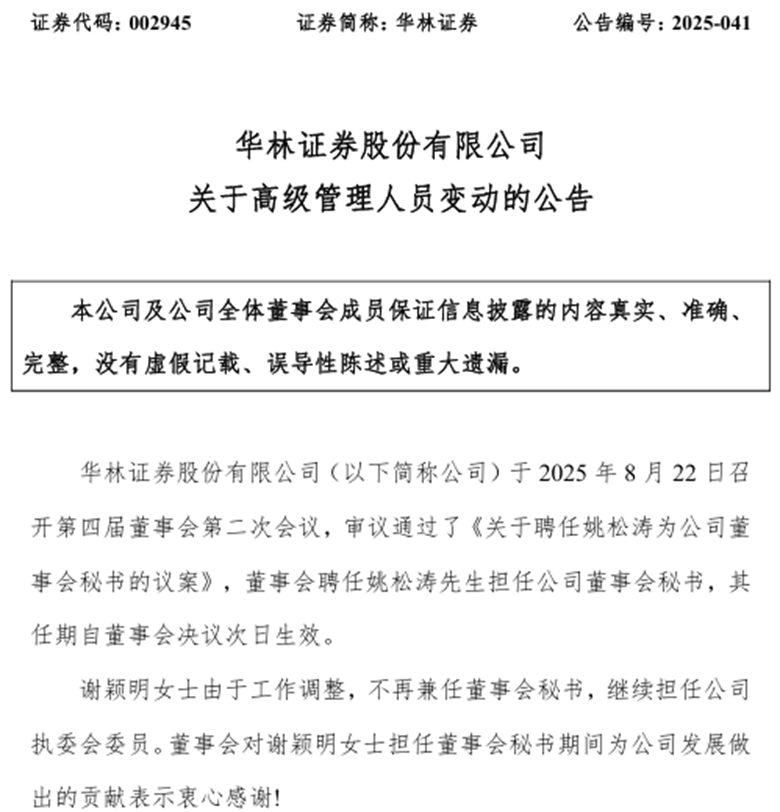 业绩爆涨的同时,华林证券还悄悄完成了一次“关键换血”——聘任姚松涛当新任董事会秘书,原董秘谢颖明转任执委会委员。