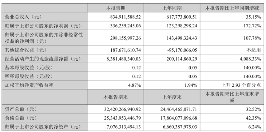 业绩指标整体向好:扣非净利润2.98亿元,同比增长107.78%;经营活动产生的现金流量净额达83.81亿元,同比激增4088.33%,资产负债结构也保持稳健,总资产规模324.20亿元,较上年末增长32.52%。