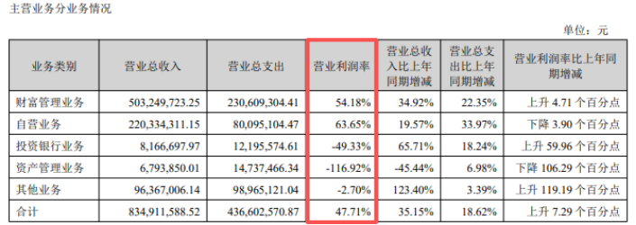 此外,华林证券2025年上半年业务利润率呈现显著分化格局,财富管理、投资银行业务盈利韧性凸显,自营业务利润率同比略有下降,资产管理业务则陷入亏损,比上年同期下降了超过100个百分点,公司整体营业利润率为47.71%,同比上升7.29个百分点。