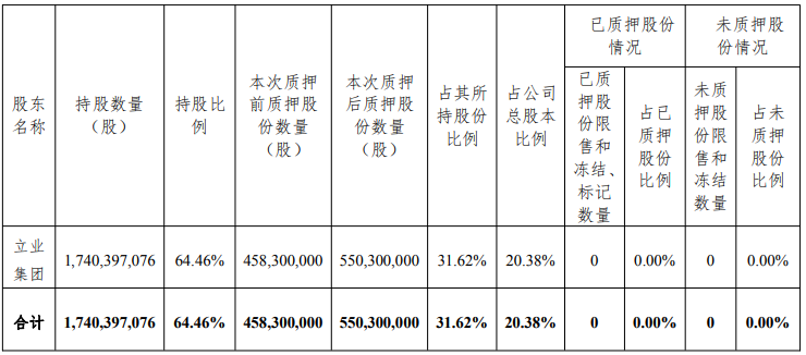 华林证券2025年10月30日披露的关于控股股东部分股份质押的公告显示,截至公告披露日,公司控股股东立业集团持股数量为1,740,397,076股,持股比例为64.46%;本次质押后质押股份数量为550,300,000股,占其所持股份比例的31.62%,占公司总股本比例的20.38%。