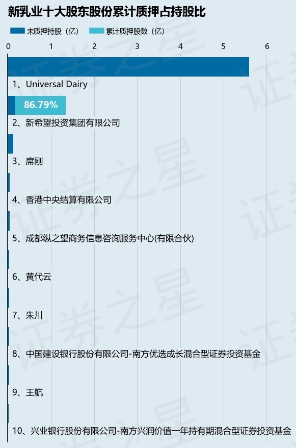 截止本公告日,股东新希望投资集团有限公司已累计质押股份1.17亿股,占其持股总数的86.79%。本次质押后新乳业十大股东的累计质押股份占持股比例见下图: