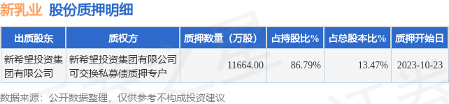 新乳业(002946)10月24日公开信息显示,股东新希望投资集团有限公司向新希望投资集团有限公司可交换私募债质押专户合计质押1.17亿股,占总股本13.47%。质押详情见下表: