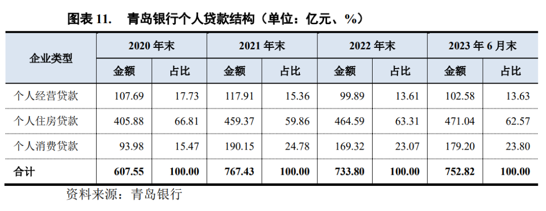 其中,住房贷款是该行个人贷款的最主要来源,报告期内在个人贷款中的占比都在六成左右。而个人消费贷款则是青岛银行个人贷款的第二大来源,报告期各期贡献了15.47%、24.78%、23.07%和23.8%的个人贷款,2021年占比最高。