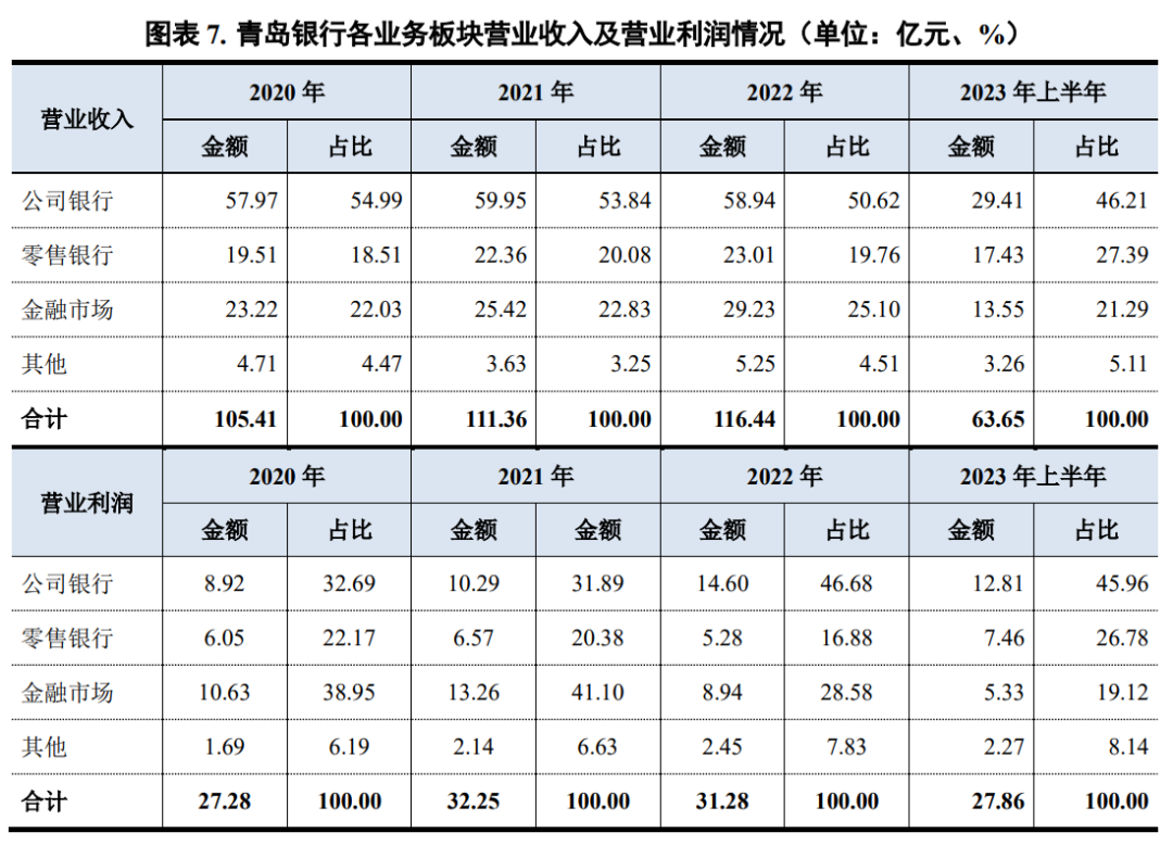 业务方面,青岛银行业务主要包括公司银行、零售银行和金融市场三大板块,其中公司银行业务对该行营收贡献度较高。2020-2023年上半年,公司银行业务在营收中的贡献率分别为54.99%、53.84%、50.64%和46.21%,均在半数左右。
