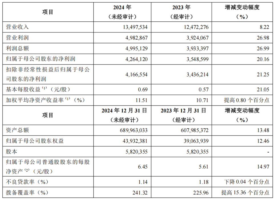 数据显示,青岛银行2024年营业收入达到134.98亿元,同比增长8.22%,归属于母公司股东的净利润为42.64亿元,同比增长20.16%。