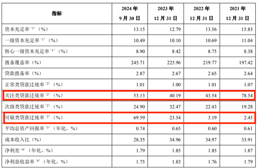 值得关注的是,截至2024年三季度末,贷款减值准备为95亿元,较去年末增长18.79%。而且,相较于2023年末,关注类贷款迁徙率从40.19%上升到53.13%,可疑类贷款迁徙率从23.54%大幅攀升至69.59%,各级资本充足率在上市城商行中处于下游。后续资产质量的变化走向,无疑成为市场关注焦点。