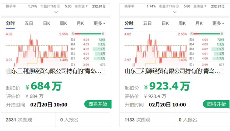 到了今年2月5日,阿里资产司法拍卖平台显示,青岛银行470万股股票即将公开拍卖。此次拍卖的股票持有方为山东三利源公司,起拍价总计约1607.4万元,每股均价3.42元。而这些股票,是青岛市崂山区人民法院依法处置的司法拍卖资产。