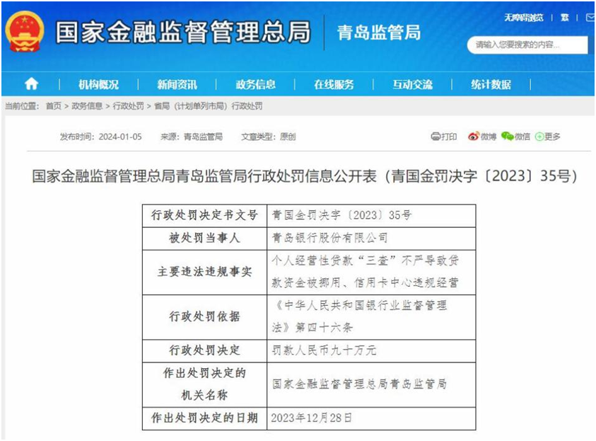根据处罚信息,因个人经营贷款“三查”工作落实不力,致使贷款资金被挪用,加之信用卡中心存在违规经营行为,青岛银行被处以90万元罚款。同时,青岛银行即墨分行也未能幸免,由于向资本不足的企业发放固定资产贷款,被罚款30万元。不仅如此,与这些违规事件相关的负责人均受到警告处罚,这一系列处罚彰显出监管部门对银行合规经营的严格要求,也为青岛银行敲响了强化内部管理与风险防控的警钟。