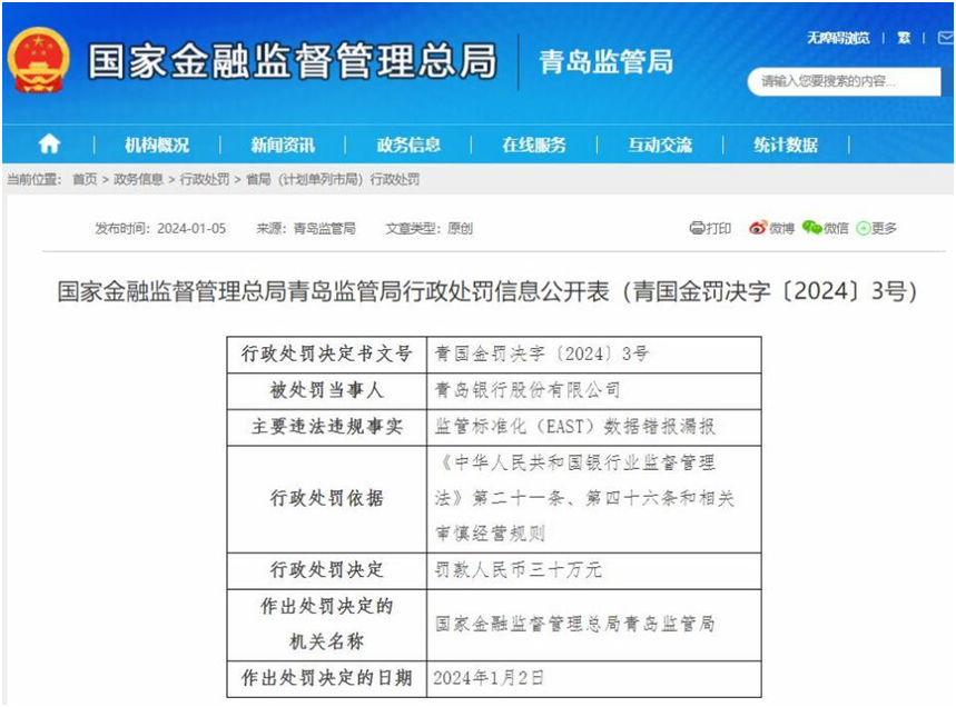 去年,青岛银行在监管层面遭遇重大警示。仅2024年第一季度,青岛银行及其分支机构共收到5张罚单,处罚金额合计超200万元。