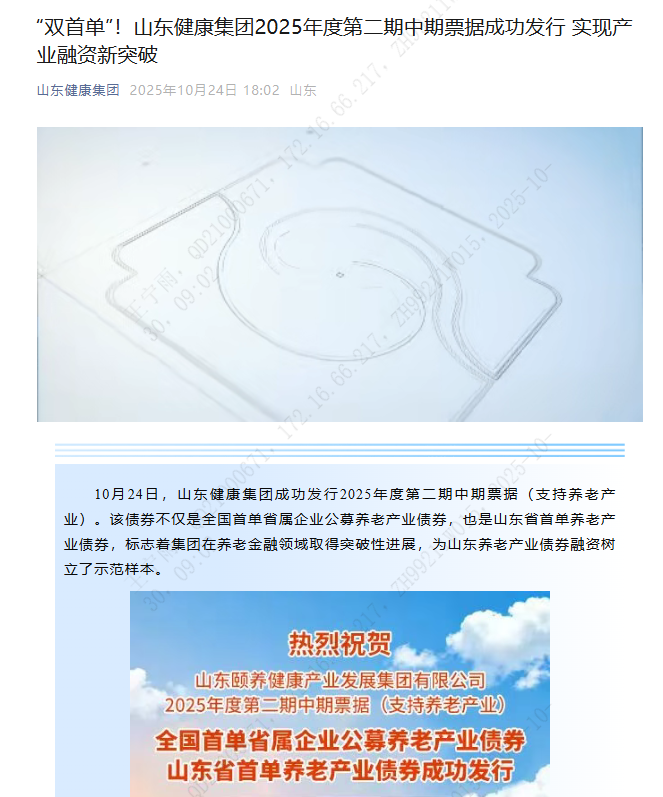 10月24日,由青岛银行股份有限公司牵头主承销的山东颐养健康产业发展集团有限公司2025年度第二期中期票据(支持养老产业)在银行间市场成功发行,金额2亿元,期限3年,发行利率1.96%。本期债券为全国首单省属企业公募养老产业债券暨山东省首单养老产业债券,标志着青岛银行在养老金融领域取得突破性进展,也为银行间市场支持养老产业融资提供了创新样本和示范引领。
