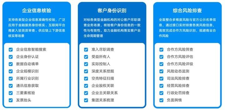 例如对企业法定代表人/实际控制人/受益所有人/关联企业的风险扫描、历史风险的追溯识别等,确保能够满足各类尽调需求,为金融机构提供更为全面、深入的尽职调查服务的数据支持。