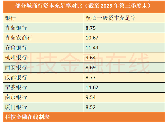 以同区域的齐鲁银行和青岛农商行对比看,2025年第三季度末,齐鲁银行核心一级资本充足率为11.49%,青岛农商行为13.67%,均高于青岛银行的8.75%。