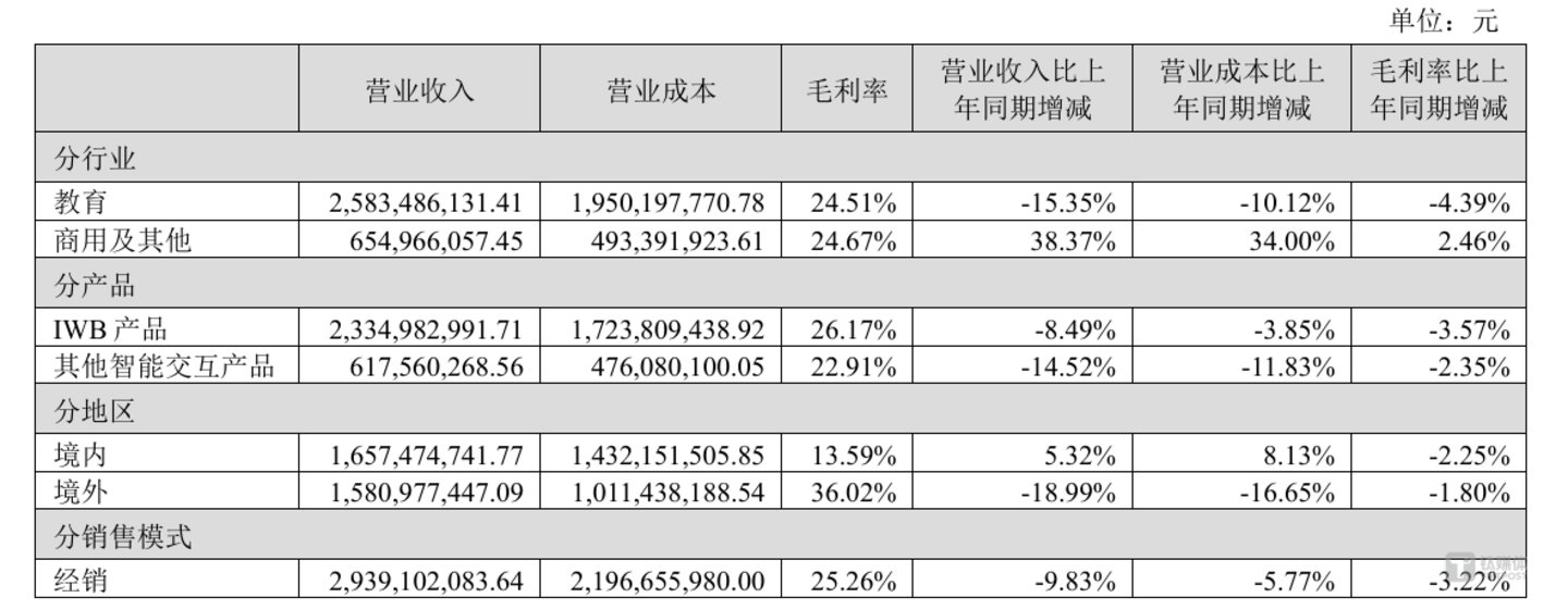 分产品看,作为营收压舱石的IWB(智能交互白板)产品,实现营收23.35亿元,占总营收72.10%,但同比下滑8.49%。该产品在全球教育市场排名第二,旗下海外品牌“Newline”在美国市占率第一,但其增长乏力甚至下滑,反映出核心产品面临市场趋于饱和、竞争加剧的内外困境。其他智能交互产品营收6.18亿元,同比下滑14.52%,成为另一大拖累。