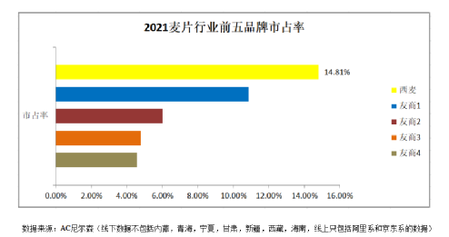 作为燕麦产业里的龙头,西麦食品一直稳扎稳打构建渠道壁垒,对线上线下双渠道均衡化布局,让自己俨然已成为“渠道优等生”,这在全球知名的市场调研公司AC尼尔森监测到的“2021年麦片行业前五品牌市占率”数据中得到了体现。