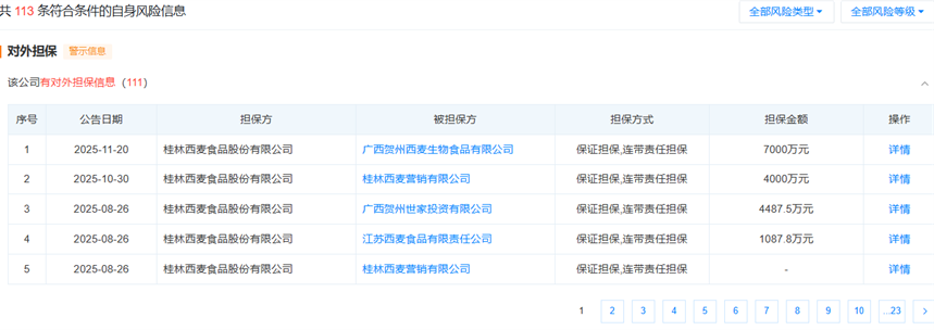 这已是西麦食品在2025年内多次为子公司提供担保的又一举措。截至目前,公司对外累计担保总额已达3.4亿元,占最近一期经审计净资产的比例达22.45%。数据显示,西麦食品自2019年至今已有111条对外担保记录,频率之高引人关注。例如,今年10月底其刚向桂林西麦营销有限公司提供4000万元担保。
