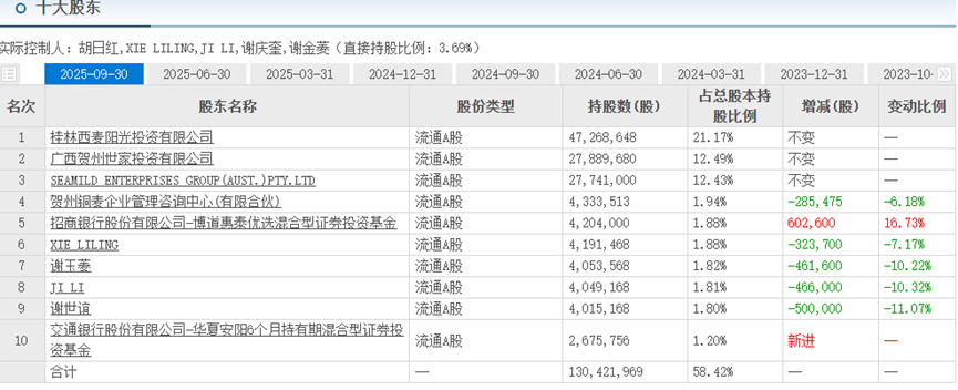 除了管理层变动,西麦食品还面临股东减持的压力。2025年第三季度,前十股东中出现多个减持情况,其中第四大股东减持28.55万股,第6-9个人股东分别减持32.4万股、46.2万股、46.6万股、50万股。