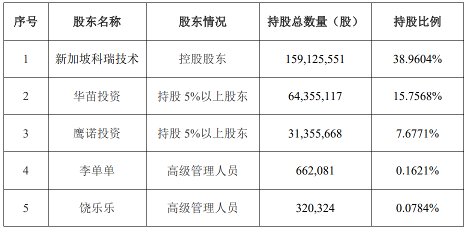 公告显示,公司股东COLIBRI TECHNOLOGIES PTE LTD(以下简称“新加坡科瑞技术”或“控股股东”)持有公司股份159,125,551股,占公司总股本比例38.9604%。新加坡科瑞技术计划通过集中竞价、大宗交易等深圳证券交易所认可的合法方式减持公司股份。新加坡科瑞技术计划减持不超过4,200,000股,即不超过公司总股本的1.0283%。其中以集中竞价方式减持的,在连续90个自然日内减持股份的总数不超过公司股份总数的1%;以大宗交易方式减持的,在连续90个自然日内减持股份的总数不超过公司股份总数的2%,且受让方六个月内不得转让其受让的受限股份。