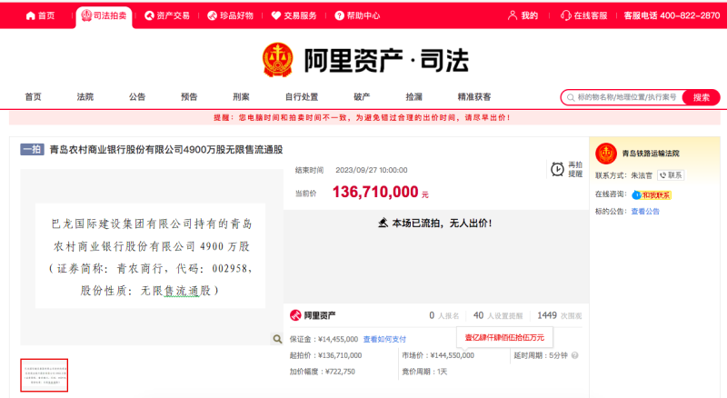 9月27日,阿里司法拍卖网显示,巴龙国际建设集团有限公司(下称巴龙国际建设)持有的青岛农村商业银行股份有限公司(下称青农商行,002958)4900万无限售流通股在该平台拍卖,起拍价约1.37亿元。该场拍卖共1449次围观,40人设置提醒,却无人报名。