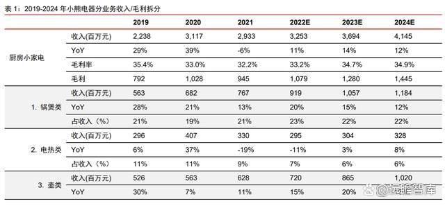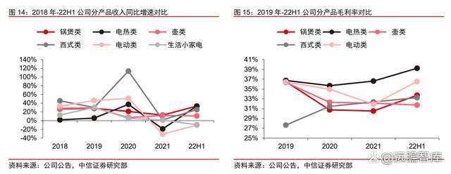收入端:公司目前主要品类包括厨房小家电、生活小家电和其他小家电,其中厨房小家电包括锅煲类、电热类、壶类、西式类和电动类 5 大细分品类,其他小家电包括个护、母婴、居家和净水 4 大细分品类。