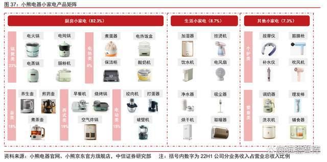 目前公司品类矩阵包括厨房/生活/其他小家电,22H1 各品类收入分别占营业总收入的 82.3%/8.7%/7.3%,厨房小家电仍然是小熊电器的最主要品类,其中锅煲类/电热类/壶类/西式类/电动类细分品类的收入占比分别为 23%/8%/18%/19%/15%。