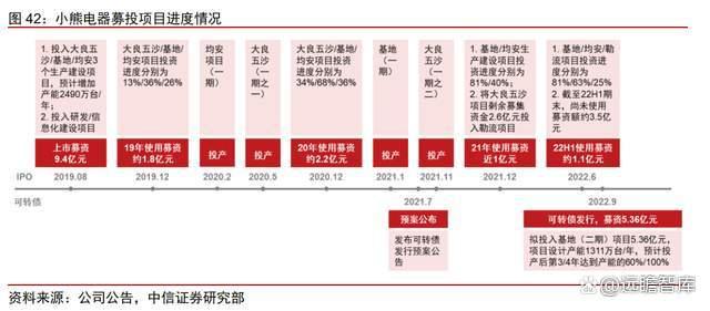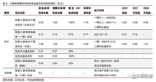 此外,公司于 2022 年 9 月发行可转债,募资 5.36 亿元,将投入于智能小家电制造基地二期项目建设,预计投产后第 4 年达到产能的 100%(项目设计产能为 1311 万台/年,为现有产能的 0.35 倍,销售收入达 11.2 亿元/年),有利于公司提升生产线的生产效率,实现降本增效。