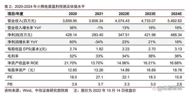 2.小熊电器系国内创意小家电的龙头,其产品在年轻人群体中粘性较高,从而享受一定的龙头及品牌溢价,我们给予公司 2022PE 估值 25 倍。