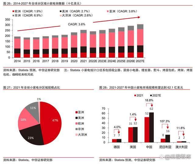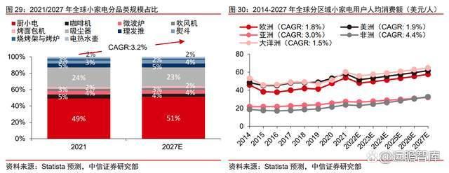 全球小家电市场千亿美金空间,新兴市场增量空间广阔。根据 Statista,2021 年全球小家电销售额达到 256.2 亿美元,同比+9.8%,其中欧洲/美洲/亚洲/非洲/大洋洲销售额占比分别为 18%/23%/47%/11%/1%。同时 Statista 预计,2027 年全球小家电销售额将达 308.9 亿元,对应 2014-2027 年 CAGR 达到 3.6%,其中亚洲和非洲新兴市场增速高于平均,对应 2014-2027 年 CAGR 分别为 3.8%/6.9%。