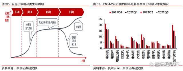 根据奥维云网,22H1 抖音电商厨小电销售额份额达到 13%,逐步蚕食淘系/京东的份额。此外,处于成长期的新兴品类线上销售占比更高,如近两年增速亮眼的空气炸锅品类,其 22H1 线上销售额占比达 93%,高于处于成熟期的电饭煲/电磁炉等品类(分别为 60%/64%)。