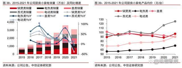 2021 年公司锅煲类/电热类/壶类/西式类/电动类厨小电均价分别为 97/70/90/125/91 元/台,同比+10%/+9%/-3%/+8%/+12%,未来随着公司对精品化策略的持续执行,我们认为公司厨小电产品均价将会稳步提升,拉动毛利中枢上行。