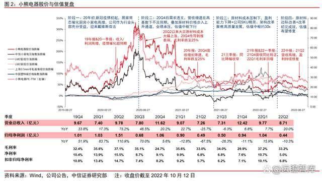 回溯小熊电器上市以来的 3 年成长之路,其股价经历过疫情初起时需求前置爆发所带来的戴维斯双击(2019/2020 年业绩分别同比+45%/+60%,动态 PE 上行至 80x),股价增长接近 250%(同期中信小家电指数约增长 50%),也经历过在原材料成本压制叠加需求透支下业绩不及预期的低迷期(2021 年业绩同比-34%,估值中枢回落至 30x),市场对“疫情受益股”小熊电器未来增长的可持续性存在疑虑。