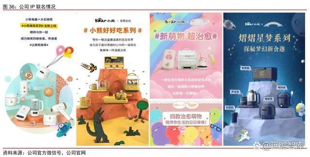 公司积极与知名 IP 联名,为旗下小家电产品赋予年轻化符号,包括与小马宝莉(My Little Pony)联名推出“熠熠星梦”系列和“绿野仙梦”系列;与日本知名艺术家大石晓规(Akinori Oishi)推出“小熊微笑系列”,品类覆盖养生壶、电热锅、电饭煲等个性化的厨小电,有利于公司品牌知名度在年轻人群体中提高。