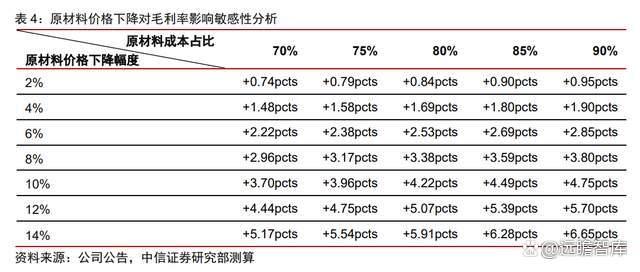 根据我们测算,在自产比例/原材料成本占自产成本比例均为 80%时,若原材料价格同比下降幅度达 8%,公司下季度毛利率有望同比+3.4pcts。