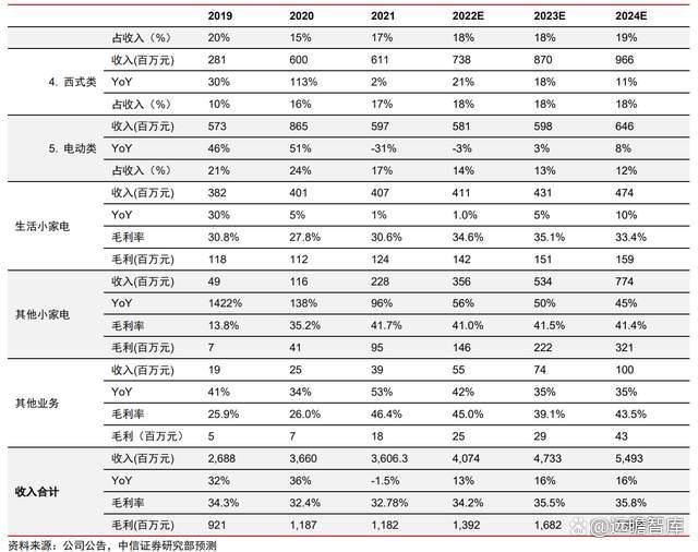 我们预计公司厨房小家电业务 2022-2024 年收入为 32.5/36.9/41.5 亿元,同比+11%/+14%/+12%,其中西式类/锅煲类厨小电分别显著受益于空气炸锅行业红利、公司电饭煲后续的放量,我们预计 2022-2024 年公司西式类厨小电收入同比+21%/+18%/+11%,锅煲类厨小电收入同比+20%/+15%/+12%。