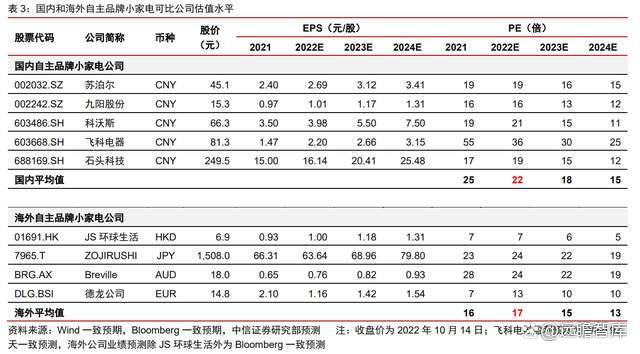 对比国内/海外自主品牌小家电公司,2022 年平均 PE 分别为 22/17 倍。