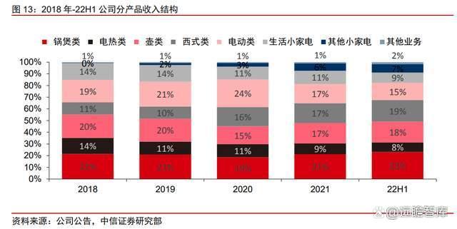 分产品:锅煲类+西式类厨房家电表现亮眼,22H1 收入占比超 40%。