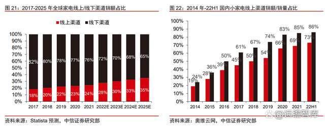 1.全球方面:根据 Statista,2021 年全球家电销售中,线上渠道占比 24%,并有望在 2025 年达到 35%。