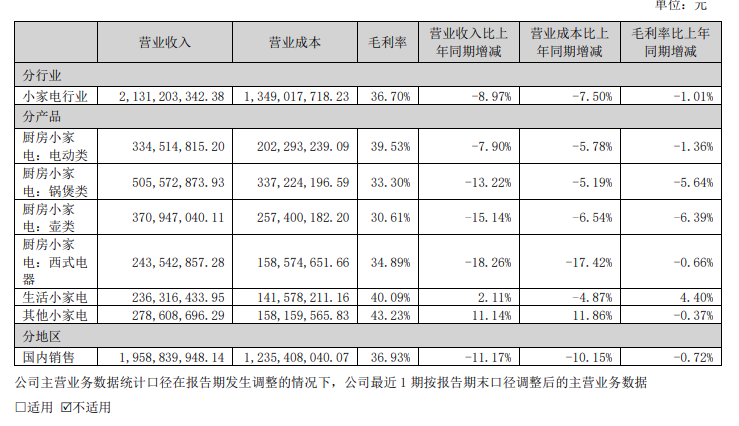 具体到小熊电器厨房小家电各产品板块,营收及毛利率全线下降。电动类、锅煲类、壶类西式电器的营收分别同比下跌7.90%、13.22%、15.14%及18.26%;毛利率分别下降1.36、5.64、6.39及0.66个百分点。