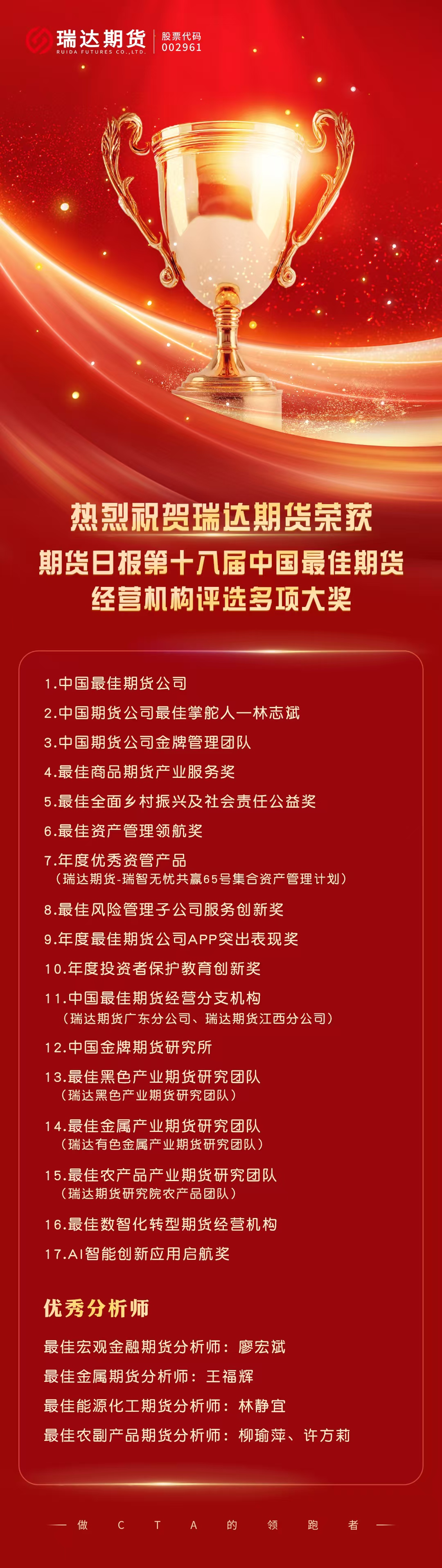 11月26日,由期货日报与证券时报联合主办的“第十八届中国最佳期货经营机构及最佳期货分析师评选”颁奖典礼在长沙隆重举行。 瑞达期货 凭借卓越表现,一举斩获“中国最佳期货公司”等17项机构综合大奖,另有5名分析师荣膺“最佳期货分析师”称号。