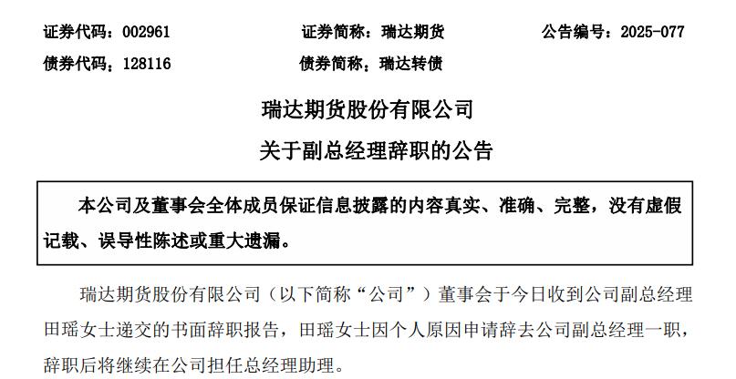 11月18日, 瑞达期货 发布公告,公司董事会于当日收到公司副总经理田瑶递交的书面辞职报告,田瑶因个人原因申请辞去公司副总经理一职,辞职后将继续在公司担任总经理助理。