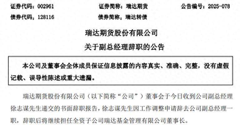 公告显示, 瑞达期货 股份有限公司董事会于当日收到副总经理徐志谋的书面辞职报告。徐志谋因工作调整申请辞去公司副总经理一职,辞职后将继续担任全资子公司 瑞达基金管理有限公司 董事长,辞职报告自送达公司董事会之日起生效。截至公告披露日,徐志谋未直接持有公司股份,通过 泉州运筹投资有限公司 间接持有公司股份98,700股。